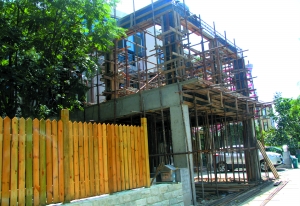 近日,該小區(qū)3區(qū)19號1棟正在裝修,工人在樓外圍起柵欄,占用人行道和公共綠地,并在其房屋后門外加蓋兩層建筑。業(yè)主稱加蓋后將嚴(yán)重影響鄰居采光。