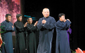 郭德綱、于謙合作10周年專場演出14日如約開場,現(xiàn)場座無虛席。此番亮相的郭德綱顯得頗為低調(diào),他在對話中表示,自己只是一個說相聲的,“能力有限,水平一般”。此次演出郭德綱個人為舟曲災(zāi)區(qū)捐出了10萬元,德云社和演出承辦方也各捐出5萬元,對于因為哀悼日而暫停的15日的演出,郭德綱表示:“所有15日票的觀眾都可以去退票,也可以留著,等我們開演的時候繼續(xù)使用,F(xiàn)在不是我們不訂演出時間,實在是北展后面的演出太多了,一切需要重新協(xié)調(diào)。”