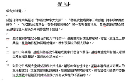 就在新聞鬧的沸沸揚(yáng)揚(yáng)的同時(shí),林嘉欣所屬的香港經(jīng)紀(jì)公司星皓昨天發(fā)表聲明,提到“公司和林嘉欣合作9年,堅(jiān)持展現(xiàn)她健康、清新及獨(dú)立的藝人形象。2010年彼此達(dá)成獨(dú)家代理合作關(guān)系。”更強(qiáng)調(diào)“近日出現(xiàn)對林嘉欣抹黑、詆毀的傷害性消息,正在調(diào)查消息的源頭,并保留法律追究的權(quán)力!