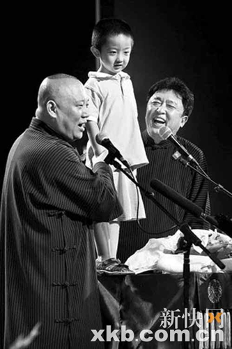 整場(chǎng)演出持續(xù)了近4個(gè)小時(shí),全場(chǎng)笑聲、掌聲、喝彩聲不停,觀眾都說這次壓軸出演的老郭很“給力”。被要求返場(chǎng)后,郭德綱竟然把云字輩最小徒弟、于謙的兒子抱上桌子,用巧克力引誘他唱曲。結(jié)果小家伙上來就自選了一段《我是一個(gè)兵》,老郭又借著表示誰侵略我們就給打過去,還和小家伙合唱了一句太平歌詞。