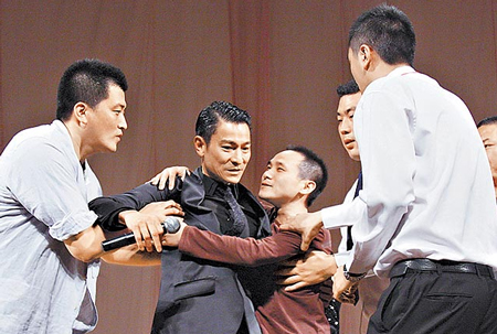 中新網9月21日電 電影《通天神探狄仁杰》前晚在北京大學舉辦首映,劉德華(華仔)、劉嘉玲、李冰冰、梁家輝都到場,活動進行到一半,有位男粉絲竟沖上臺熊抱華仔,被保安強行拉下臺,華仔見狀連忙斥喝保安,要他們動作不要太粗暴,展現(xiàn)巨星風范。