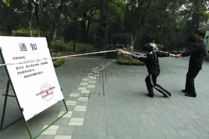 在公園門口和警戒線旁,均貼出落款為公園管理處的通知:“因公園9月25日有重要活動,需占用此場地,望各晨練群體暫;顒1天”,通知中的時間部分有被白紙粘貼的痕跡。
