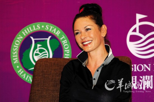 在昨日出席比賽的眾多明星中,好萊塢女星凱瑟琳·澤塔·瓊斯無(wú)疑是最受媒體關(guān)注的一個(gè)。瓊斯與丈夫邁克·道格拉斯都是高爾夫球達(dá)人,對(duì)于兩人的球技較量,凱瑟琳謙虛地說(shuō):“丈夫比我打得好多了,不過(guò)我打球的姿勢(shì)比他好看!”