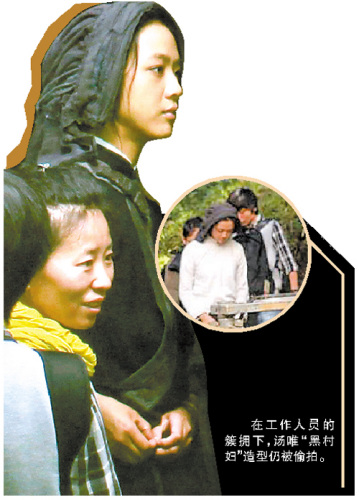 湯唯在8月底入組拍攝《武俠》,由于劇組謝絕媒體探班,兩個月來的拍攝內(nèi)情不為人知。日前媒體偷拍到該片工作現(xiàn)場,更曝光了湯唯“黑村婦”造型。照片中的湯唯頭上包裹著一塊藍(lán)布,身穿斜襟白布衫,腳穿木屐,皮膚黝黑,一副典型“山野村姑”打扮。這是該片繼甄子丹隱居殺手造型遭偷拍之后又一泄露事故。