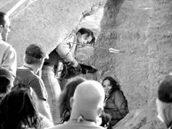 昨日(18日)拍攝的這場戲講的是布蘭登·弗雷澤與瑪麗亞·貝羅遭到敵人的追殺,二人在沙漠中一邊躲避弓箭的襲擊,一邊還擊,雕翎箭與短槍的交火頗有些“關(guān)公戰(zhàn)秦瓊”的味道。布蘭登扮演的里克一身牛仔裝扮,手拿一把短槍,依舊延續(xù)了前兩集中的扮相,而瑪麗亞扮演的艾芙琳則穿著深棕色短款夾克,足蹬馬靴,手持一把手槍。導(dǎo)演羅伯·科恩一聲“開始”后,他們在巖石后緊張地躲避著敵人的追趕,此時,一支雕翎箭射來,擦著布蘭登的右臂射進土墻,布蘭登立即伏地掩護瑪麗亞,并迅速用槍還擊,而瑪麗亞也起身與他并肩作戰(zhàn)。盡管這個鏡頭在片中只出現(xiàn)短短的10秒鐘,但科恩導(dǎo)演還是讓兩位主演拍了3遍。