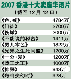臨近年底,電影界又到了總結(jié)之時。前日,香港影業(yè)協(xié)會公布了今年香港電影的票房情況:因為經(jīng)濟(jì)回升,香港電影也隨之升溫,全年票房有望超過10億港元,而僅《色,戒》一片就以近5000萬的票房,撐起了華語片的半邊天。