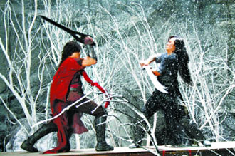 發(fā)布會當天拍攝的是聶風和步驚云的最后一場雪中決斗戲,這也是全片的一場重頭戲。在拍攝時還發(fā)生了一點“意外”,鄭伊健的劍不小心打到了郭富城的頭上,現(xiàn)場工作人員非常緊張,郭富城安慰大家說沒關系,沒流血,結果拍攝結束,郭富城摘掉假發(fā)后才發(fā)現(xiàn),被打到的地方竟然腫得老大,郭富城打趣道:“腫得像乒乓球,就當迎接奧運了。”