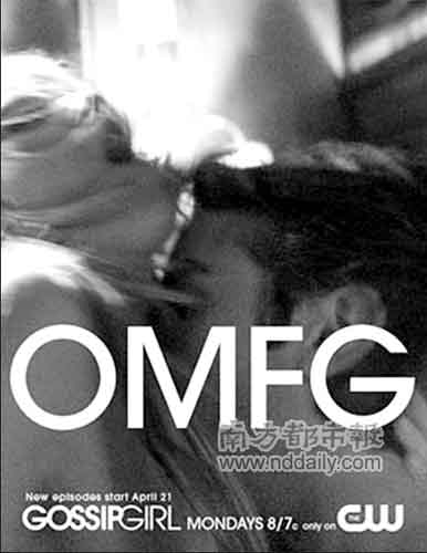 《緋聞女孩》是今年CW電視臺(tái)的新劇,由曾經(jīng)紅極一時(shí)的《橘子郡男孩》(TheO.C.)制作人打造,盡管收視率同樣不高,但是在全美掀起了新的時(shí)尚潮流。作為偶像劇,劇情并沒有特別的新意,但是該劇制作非常精良,從音樂到服飾,全部走在時(shí)尚最前沿,再加上光鮮亮麗的主演,在劇中盡情的談情說愛,十分養(yǎng)眼,在美國(guó)成為高中生追捧的話題劇集。經(jīng)過編劇罷工風(fēng)波,《GossipGirl》最近重返美國(guó)小屏幕,為了打響聲勢(shì),CW電視網(wǎng)制作兩款海報(bào),引起不少爭(zhēng)議,其中一款以主角C和B的激吻為畫面,另一款主打S和N上床的激情戲,并打上“OMFG”的大字。