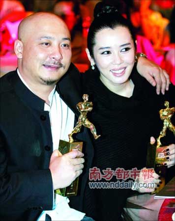 在領(lǐng)過最佳影片獎下臺后,媒體要求王全安捧杯留影時,他并沒有忘記坐在身邊的余男,右手拿著獎杯,左手自然地搭在余男的肩上,兩人淡定愉悅的面對閃爍的鏡頭。