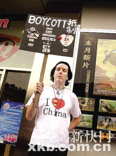 一位網(wǎng)友在他的博客中介紹了事情的經(jīng)過:“在北大教書的美國人Tim Lies和他的中文翻譯日前來到位于北京北三環(huán)的華星國際影城,手舉著一個寫著‘BOY-COTT 抵制’的牌子開始了他抵制好萊塢電影《功夫熊貓》的實(shí)際行動。他希望中國電影不要變成第二個好萊塢。”
