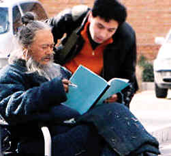 “花白頭發(fā)被梳成一個(gè)髻,長(zhǎng)長(zhǎng)的白胡須,面龐通紅,一身灰藍(lán)色的、有點(diǎn)破舊的長(zhǎng)褂子”,這,便是《孔子》中的周潤(rùn)發(fā)。周潤(rùn)發(fā)是一路拿著劇本走出來的,那讀著劇本的姿勢(shì)還真有些像是古人捧著卷軸閱讀的樣子。歷史上的孔子歷經(jīng)波折、磨難,最終修成圣人,而周潤(rùn)發(fā)的這身造型似乎也要折射孔子一生的起伏,在那長(zhǎng)褂子上還有一些絨毛、線團(tuán),顯得有些落魄潦倒。