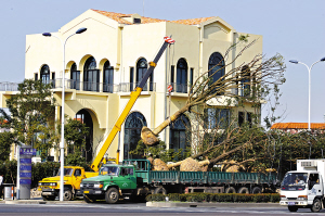 李家院外,工人昨日正用吊車栽種多棵香樟樹,起綠化和屏障作用。