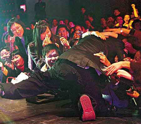 力宏與熱情歌迷握手時(shí),有歌迷緊拉他的手不放,他沒想后果便也以熱情響應(yīng),蹲下來與歌迷手牽手地繼續(xù)唱歌,旁邊大班女歌迷見狀也馬上伸出手親近偶像,霎時(shí)間群情洶涌,一個(gè)又一個(gè)女歌迷如狼似虎地抓向力宏,未幾他已被歌迷扯離舞臺(tái),整個(gè)人頭向下身體凌空在臺(tái)邊,只剩一只腳撐著臺(tái)板,該舞臺(tái)離地約一米高,眼看力宏快要跌下臺(tái)之際,此時(shí)才有兩名保安沖上臺(tái)及時(shí)抱住他的腰,意外才不致發(fā)生。