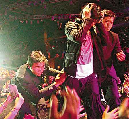 但歌迷仍未心息,保安于是與歌迷展開一場(chǎng)拔河賽,力宏就是那條“繩索”,幾經(jīng)拉扯之后,保安才成功將力宏拉回臺(tái)上,他一臉驚慌地用手掩頭,不過專業(yè)的力宏驚魂未定便繼續(xù)獻(xiàn)唱,但明顯已小心地跟觀眾席保持距離,后來走近與歌迷擊掌也小心翼翼,表演完畢即由兩名保安簇?fù)黼x場(chǎng)。