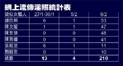 發(fā)放者先于昨日凌晨約1時(shí)30分傳出一張疑似顏穎思的淫照,直至昨午1時(shí)半,共210張淫照以zipfile(壓縮檔)形式經(jīng)電郵傳出,其中疑似鍾欣桐的照片最多,達(dá)53張(見表)。前晚開始更陸續(xù)有網(wǎng)友聲稱看過一段約32分鐘有關(guān)陳冠希與一名女藝人的短片。