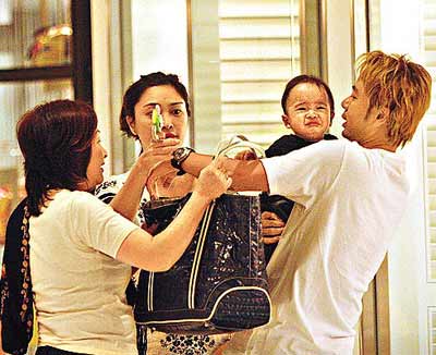 中新網(wǎng)6月17日電 香港男歌手李克勤與愛妻盧淑儀的愛情結(jié)晶立仁已經(jīng)八個月大,昨日李家三代同行到商場逛街,兒子突然吵鬧不停,克勤緊張得立刻從太太手中搶過孩子來抱,做媽媽的盧淑儀還當(dāng)街扮鬼臉引兒子笑。