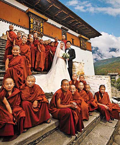 穿上婚紗和禮服的嘉玲和偉仔與一班小喇嘛合照,煞是壯觀。