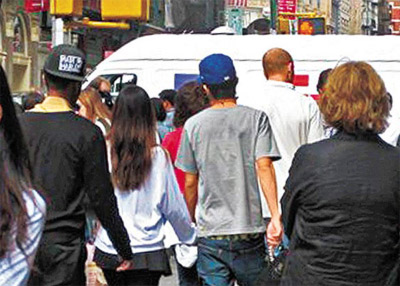 兩人手拖手在紐約街頭。