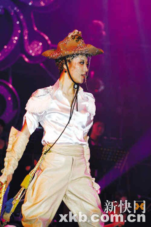 閃亮牛仔裝造型,以絲感覺面料為中性造型增添女人味。閃亮牛仔帽,復(fù)古袖子,飄逸馬褲,流蘇腰帶以及褶皺長手套,都是這個造型值得細細品味的潮流細節(jié)。