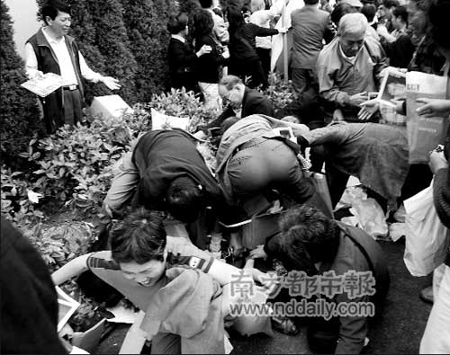 更有甚者,還有小偷來(lái)到混亂的現(xiàn)場(chǎng)企圖混水摸魚,F(xiàn)場(chǎng)記者說(shuō),本來(lái)打算去拍社會(huì)新聞的一家報(bào)社攝影記者,剛到現(xiàn)場(chǎng)就變成了社會(huì)新聞的主角!八チ艘粋(gè)人,說(shuō)是偷相機(jī)的,二人扭打著從外面進(jìn)來(lái),后續(xù)沒(méi)看到,反正警察也處理了……而這件事情教育所有的記者,把包拉到自己看得見(jiàn)的范圍……”