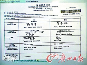 據悉,嘉欣、晉亨二人已于10月28日在婚姻注冊處辦理登記注冊結婚的手續(xù)。晉亨在職業(yè)欄填上行政董事,嘉欣則填寫藝人;在婚姻狀況一欄上,亨亨填上離婚,而嘉欣填上未婚。