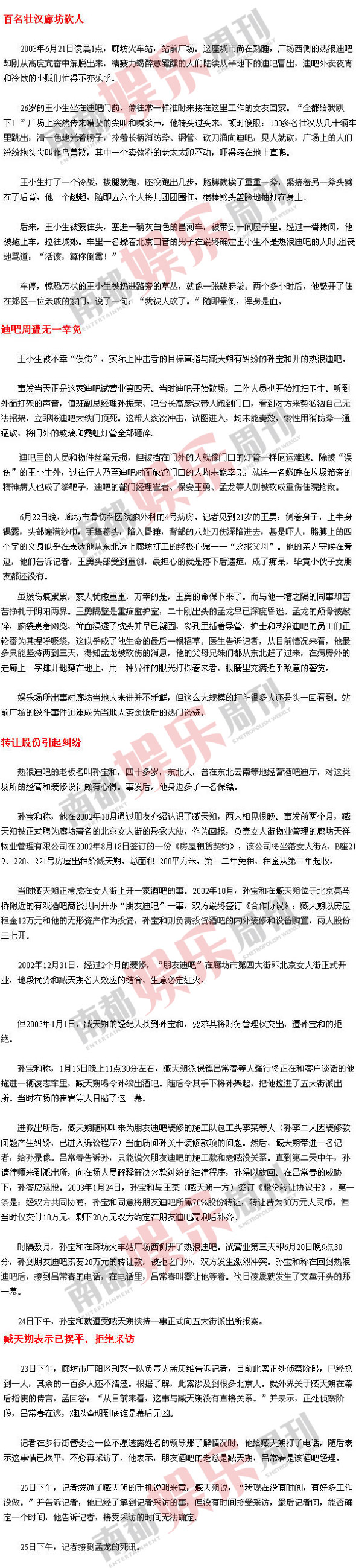 2003年的我正供職于京城某家在市場上享有盛譽的報社。那年夏天,孫寶和找到報社,拿了一大堆文字資料和現(xiàn)場照片,聲稱自己遭黑社會迫害,幕后主謀就是歌星臧天朔。當時報社在異地采訪問題上一直相當慎重,但沒想到很快就得到領導的充分許可。我和另一名攝影記者連夜趕往廊坊進行了一周多的調(diào)查。令我深感意外的是,這么大動靜的毆斗居然沒有第二家媒體介入,更談不上披露問題,相關的細節(jié)和猜想也僅在群眾中間悄然流傳,我們成了惟一到現(xiàn)場采訪的記者。