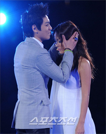 據(jù)體育朝鮮報(bào)道,15日晚7時(shí),在首爾蠶室室內(nèi)體育館舉行的“2008 Mnet-KM音樂節(jié)”( 以下簡稱“MKMF”)上,李孝利和T.O.P在共同演繹《謊言》時(shí),表演了兩個(gè)嘴唇互碰的熱吻場面。