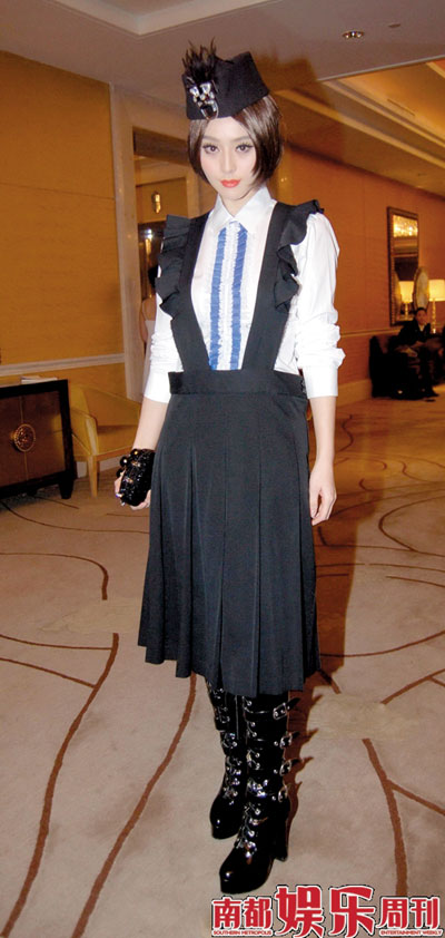 在所有范小姐的著裝標識中,我們通常除了名牌看不到其他。但這一次,我們看到了,看到了可能是范冰姐企圖對“風格”的一種創(chuàng)造。學院派裙子和搖滾靴子的組合,在范小姐的具體實踐中,成為了大堂服務生的制服創(chuàng)新的最佳示范。