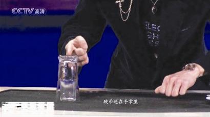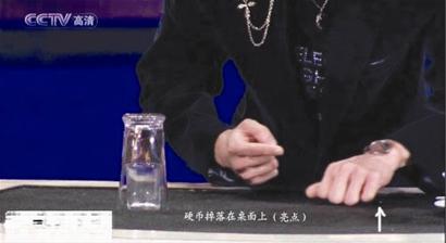 這個(gè)魔術(shù),實(shí)際上董卿是個(gè)托,因?yàn)槟g(shù)不涉及職業(yè)道德的問題,只要給觀眾一個(gè)驚喜就可以了,董卿在兩個(gè)硬幣上簽名,當(dāng)然字體和樣式要相近,私下里簽好的早已經(jīng)給劉謙了。這時(shí),硬幣掉在了桌面上,細(xì)心的觀眾可以明顯的看到硬幣的反光。
