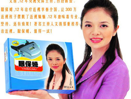 央視主持人文清曾代言治療近視的醫(yī)療器械的“眼保姆”,因廣告“涉嫌欺騙和誤導(dǎo)消費(fèi)者”而被工商局曝光。在廣告中含有大量不科學(xué)的表示功效的斷言和保證,同時(shí)還聲稱(chēng)“產(chǎn)品銷(xiāo)售現(xiàn)場(chǎng)場(chǎng)面壯觀、多家護(hù)眼中心產(chǎn)品斷貨”等,夸大其辭的廣告語(yǔ)。