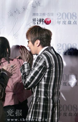 昨晚,首先走上紅毯的就是JJ林俊杰,他先是“護(hù)送”著阿Sa和容祖兒出場(chǎng),待兩人和主持人“接頭”之后,又趕回了紅毯的始發(fā)地,迎接自己公司力捧的兩位小師妹BY2。不過忙中出亂,想在簽名板上簽下“海蝶家族”的他一時(shí)間寫成了“海蝶家且”,發(fā)現(xiàn)不妙后立即把且劃掉了,寫下了族,搞得臺(tái)下的影迷們緊張了半天。