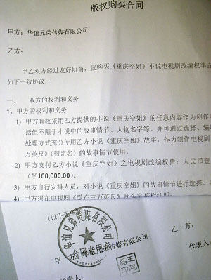 “這個(gè)合同現(xiàn)在都還在,我們能證明當(dāng)初他們是對(duì)這本書有改編興趣的,如今《非誠(chéng)勿擾》中的諸多雷同不是巧合!弊蛉赵蓭熃o記者送來(lái)了合同復(fù)印件。合同中,華誼兄弟提出:“可通過(guò)選擇、編輯等任意處理方式充分使用《重慶空姐》故事,作為制作電視劇《愛(ài)在三萬(wàn)英尺》的故事情節(jié)使用,華誼兄弟方面將支付版權(quán)費(fèi)10萬(wàn)元!痹蓭煴硎,希望法庭能夠還作者一個(gè)公道,尊重作者的合法權(quán)益。