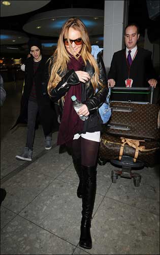 林賽·羅韓果然是帥氣難擋,黑色皮夾克配紫色襪子,最重要的是紫紅色圍巾,配飾很重要,配上林賽臉上帶著的超酷墨鏡顏色鏡片,LV大包體現(xiàn)品味。實(shí)在是太棒了,林賽果然是街拍女王。