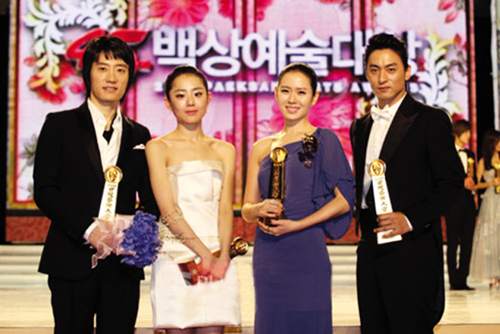 2月27日晚8時(shí),韓國第45屆百想藝術(shù)大賞在首爾奧林匹克公園舉行。電影類獎(jiǎng)項(xiàng)方面,朱鎮(zhèn)模憑《霜花店》奪最佳男主角獎(jiǎng),孫藝珍憑《妻子結(jié)婚了》當(dāng)選最佳女主角,姜禹錫導(dǎo)演的《姜哲中:公共之?dāng)?-1》獲電影大獎(jiǎng);電視劇類獎(jiǎng)項(xiàng)方面,金明敏憑《貝多芬病毒》獲最佳男演員獎(jiǎng),文根英憑《風(fēng)之畫院》獲最佳女演員獎(jiǎng),《媽媽長(zhǎng)角了》獲電視類最佳作品獎(jiǎng)和電視類大獎(jiǎng)。去年的收視熱門劇《ON AIR》只由申宇哲獲得一個(gè)電視類最佳導(dǎo)演獎(jiǎng)。電影類導(dǎo)演獎(jiǎng)則由《精彩的一天》的李允基獲得。