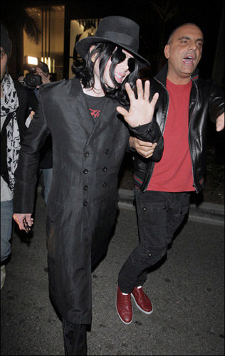 曾經(jīng)的天王,曾經(jīng)的巨星,曾經(jīng)的富豪樂(lè)壇最重量級(jí)天王邁克爾·杰克遜在宣布拍賣(mài)自己的收藏品后首次露面,在設(shè)計(jì)師Christian Audigier的陪同下外出購(gòu)物。天王不管走到哪里都有無(wú)數(shù)的狗仔隊(duì)跟蹤,當(dāng)天的邁克爾·杰克遜身穿黑色禮帽,黑色風(fēng)衣,黑色褲子黑色鞋子,帶黑色蛤蟆鏡,一身黑色更顯得容顏憔悴,皮膚蒼白,我們真的很懷念的那個(gè)曾經(jīng)的天王。
