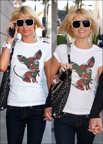 希爾頓小狗圖案T恤清新亮相 紅高跟鞋搶眼(圖)