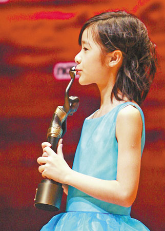 來到后臺采訪室,徐嬌已經(jīng)非常適應(yīng)這種“大場面”,一連換了4個姿勢拍照,說到在臺上的感謝詞,徐嬌說:“這些話是昨天晚上媽媽教我說的,她讓我像《長江七號》的臺詞一樣,說如果得獎了,就說得了一百分。不過這些話也是我想說的!敝劣谥苄邱Y,徐嬌說:“我拿了獎之后就來了,還沒來得及打電話給周老爸,晚上我會打電話給他,聽他說怎么慶祝。”