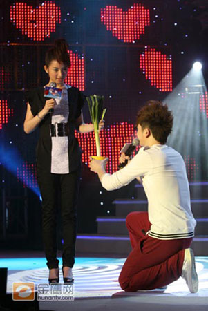 這位當紅的人氣偶像不僅迷倒了在場的觀眾,連“海豚王子”王櫟鑫都拜倒在林依晨的裙下,現(xiàn)場更是搞笑上演抱蔥求婚一幕。林依晨獻唱了《你》后,在特別環(huán)節(jié)中接受了演技大考驗,主持人即興要求林依晨表演“求婚”的橋段。這時,一旁的王櫟鑫按耐不住,自告奮勇上臺“求婚”。調(diào)皮的王櫟鑫手捧一顆大蔥,單腿跪下對林依晨深情告白:“親愛的晨晨,我知道你喜歡直樹,所以我送你一顆蔥。雖然我沒有你家直樹帥,但我會每天為你唱情,對你好,嫁給我好嗎?”惹得現(xiàn)場觀眾大笑不已,一邊的男主持人大左更是醋意大發(fā),直言喜歡林依晨很久,也要向她求婚,不過大左的求婚禮物是非常具有長沙特色的臭豆腐。面對一大盤黑乎乎的臭豆腐,林依晨似乎被其獨特的氣味嚇到,捂著鼻子直呼“我還是選擇蔥吧!”場面十分搞笑,晚會氣氛也達到了高潮。