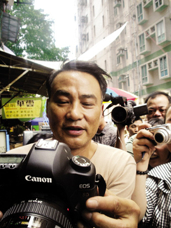 昨天的拍攝地點叫永利街。那是很窄的一條街道,其中一邊已經改造成了高樓,另一邊則保留了一些舊樓。劇組在舊樓這邊搭了些鐵架和舊式廣告招牌,營造上世紀60年代的氣氛。導演羅啟銳介紹:“這條街是香港最后一條60年代老街了,本來已經要拆掉,但是政府為了關照我們,特意推遲到我們拍完再拆。我們用這條街來重現(xiàn)當年的深水埗!备邩谴髲B的存在有時挺影響拍攝,“經常穿幫,要靠后期特效來消除”。據說,導演小時候就住在這里。