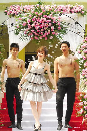 從加長(zhǎng)“悍馬”下來(lái)后,大家才發(fā)現(xiàn)眼前的王心凌跟過(guò)去的學(xué)生妹形象有了很大改觀,因?yàn)樗灰u露胸裙裝,還常常低首,露出春光無(wú)限,現(xiàn)場(chǎng)的港臺(tái)記者攝像機(jī)更是拍個(gè)不停。特別值得一提的是,引領(lǐng)這位“甜蜜教主” 登上布滿粉紅玫瑰花瓣紅毯的,是兩個(gè)裸露上身的男舞者,而記者們喝的茶是特制的桃花茶,整個(gè)發(fā)布會(huì),可謂是“桃色”意味濃厚。