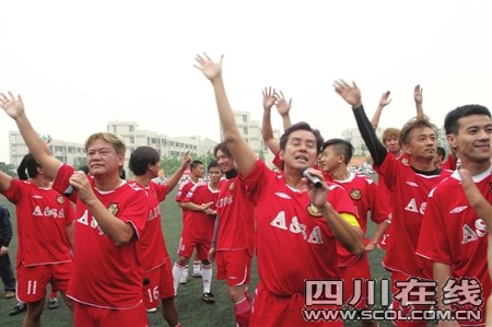 下午5時,義賽結束,現(xiàn)場出現(xiàn)感人一幕:災區(qū)的11個學生,舉著寫有“災區(qū)學子謝謝您!感恩奮進!”的大牌子來到球場中間,以示謝意。在地震當天出生的10個孩子,與明星們結上幫助對子。