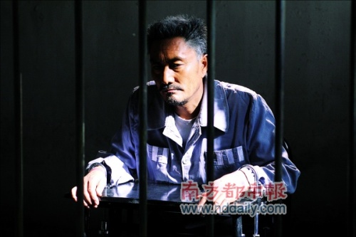 當日的內景拍攝現場是一間不足20平方米的小屋,整間小屋被布置成監(jiān)獄會見室的樣子。一道監(jiān)獄的鐵閘將小屋一分為二,鐵閘外是一張小桌,上面放著一杯沖好的茶水和一沓文件,這是律師徐崢會見犯人時所用的桌子。鐵閘里只放著一張輪椅,穿著囚服的多布杰就坐在這張輪椅上與徐崢談話。多布杰的左腿整個小腿部分由支架支撐,據說,這是一條已經被鋸過的假腿。整個囚室都籠罩在一片發(fā)藍的光線里,微塵在光里飛舞,有冷感。