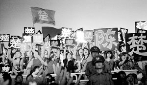 久未露面的陳楚生讓現(xiàn)場(chǎng)歌迷激動(dòng)不已,分布在看臺(tái)上各個(gè)角落的上百位“花生”始終舉著“陳楚生”、“楚”的牌子,并且喊著整齊的口號(hào),為陳楚生助陣。