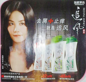 該網(wǎng)友上傳的照片中,王菲清湯掛面的造型與她特立獨(dú)行的性格相當(dāng)不符,而天后似笑非笑的表情,也并不討好消費(fèi)者。當(dāng)然,與王菲頭像并列的“追風(fēng)”牌洗發(fā)水,更被網(wǎng)友大批好似山寨貨,該品牌洗發(fā)水打出的功效是“去屑止癢”,并在海報(bào)上注明凡是購買產(chǎn)品寄送王菲海報(bào)一張,全國限量3萬張。