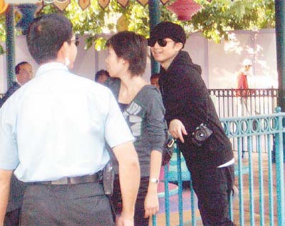手抱一名女孩的基仔,被不少游客認(rèn)出,紛紛上前要求合照,他興致很好,來者不拒。因基仔被人群包圍,更引得保安上前為他護(hù)駕,基仔又拿著相機(jī)為女孩拍照。