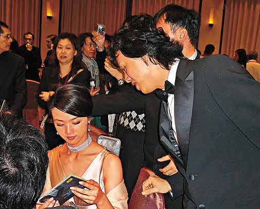 李云迪對湯唯大獻(xiàn)殷勤,在慶功宴上經(jīng)常留意她,明顯對她很有好感,記者問李云迪有沒有看《色》片?他面露尷尬說:“有,但我是看內(nèi)地版(編注:該版本刪剪了三場情欲戲)!碑(dāng)李云迪看見湯唯將其最新CD拿在手中時,他也笑逐顏開。