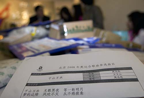 中新網(wǎng)3月12日電 據(jù)北京奧運(yùn)會官方網(wǎng)站消息,昨天是第四屆北京2008年奧運(yùn)會歌曲征集評選活動截止的日子,也成為眾多名家和普通百姓提交自己作品的高潮。記者下午在北京2008年奧運(yùn)會歌曲征集辦公室看到,僅僅今天收到的作品已經(jīng)堆積如山,而這里的工作人員正忙于整理剛剛收到的作品。在這些作品當(dāng)中,記者赫然發(fā)現(xiàn)了“周杰倫”、“林夕”、“方文山”、“小柯”等熟悉的名字。