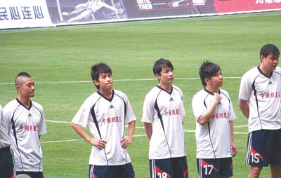 “中國明星足球隊VS好男兒足球隊公益對抗賽”日前在上海開戰(zhàn),蘇醒作為中國明星足球隊的代表參賽并獻唱了他為抗震救災原創(chuàng)的歌曲《我們在一起》。(記者王大鳴)