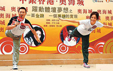 中新網8月11日電 容祖兒昨日與奧運個人全能體操金牌得主李小雙擔任奧運活動嘉賓,李小雙當場示范倒立,獲觀眾熱烈掌聲,他又教容祖兒做體操動作。李小雙指中國很大機會拿體操團體金牌,他估計中國會奪得30至36面金牌,體操占4至5面。