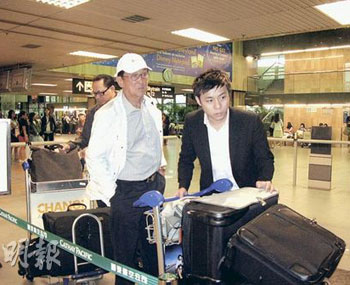 朱玲玲細(xì)仔霍啟人陪同親友抵新加坡機(jī)場(chǎng)。(圖片來源:明報(bào))
